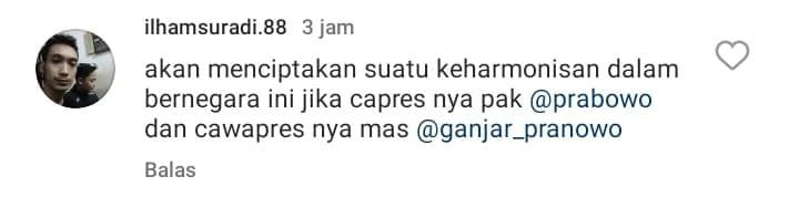 “Akan menciptakan suatu keharmonisan dalam bernegara ini jika capres nya pak @prabowo dan cawapres nya mas @ganjar_pranowo,” komentar @ilhamsuradi.88