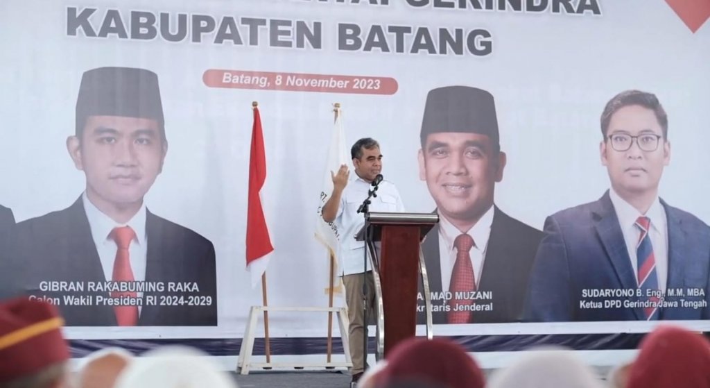 Dalam sambutannya Muzani meminta kader Gerindra di Kabupaten Batang untuk tetap semangat memenangkan pasangan capres cawapres Prabowo Subianto-Gibran Rakabuming Raka.